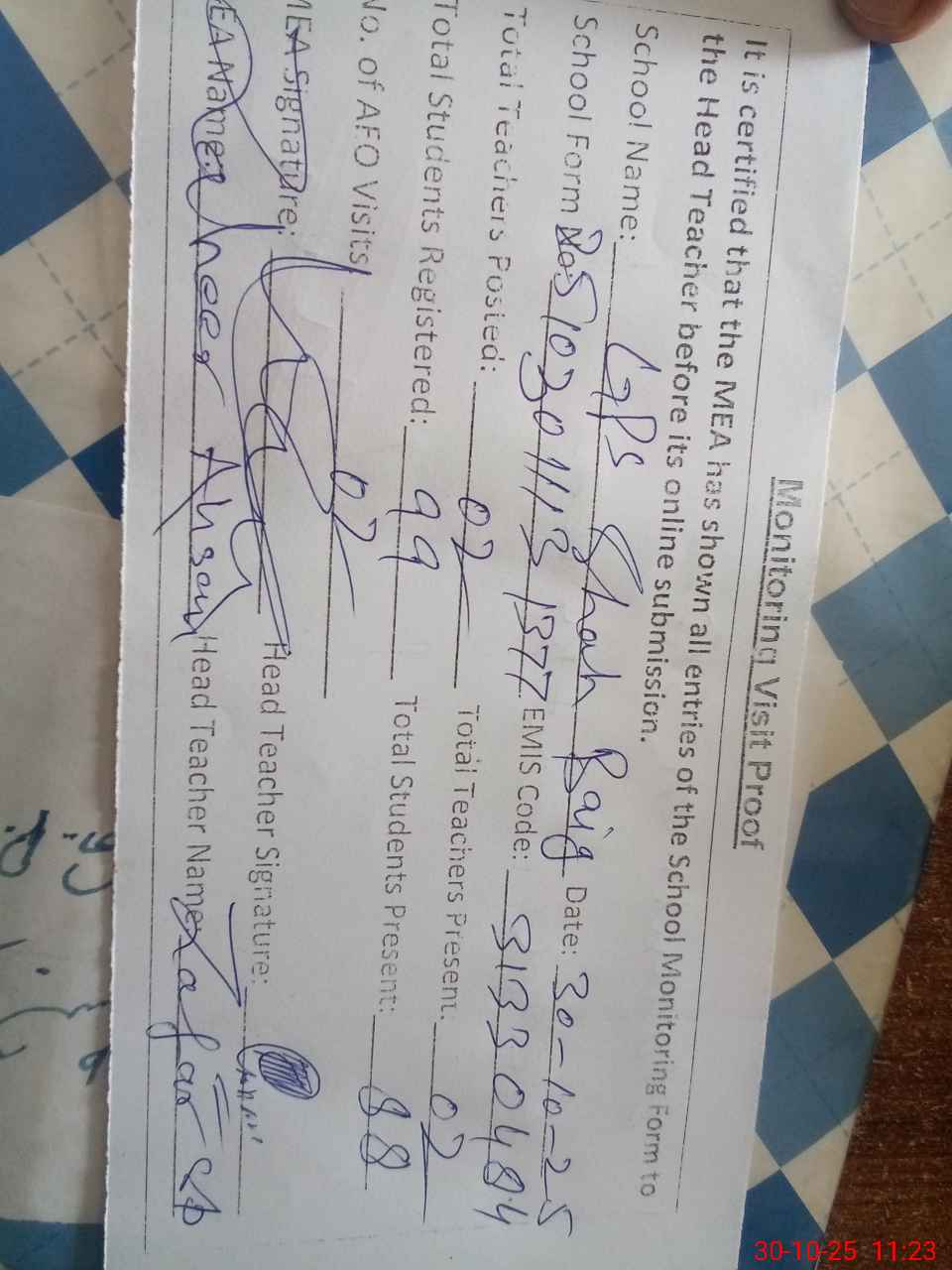| Attendance Register | Head Teacher | MEA with School | Visit Proof |