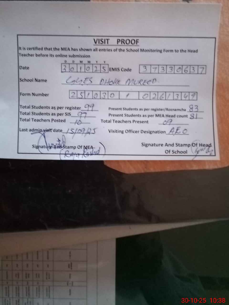 | Certified that this School was Inspected by the Undersigned MEA/DMO Today and the Information Stated Above is as Per Record. | |||||