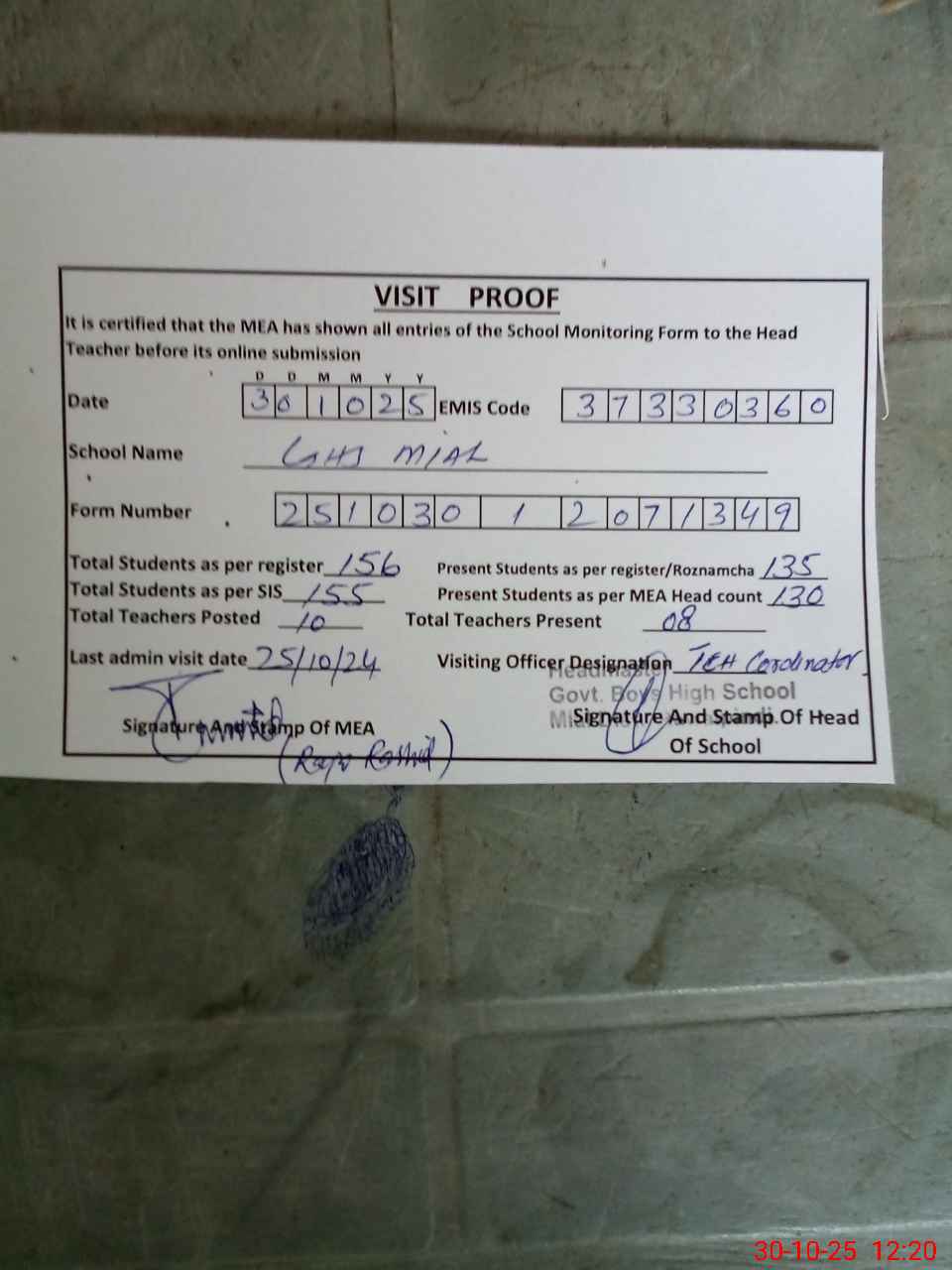 | Attendance Register | Head Teacher | MEA with School | Visit Proof |