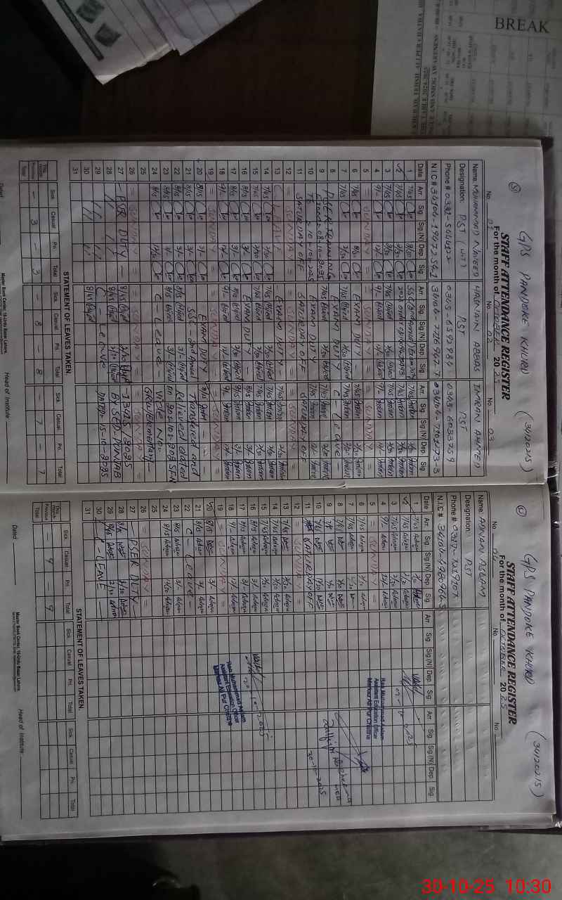| CNIC | Full Name | Designation | R/C | Absence During Last Calender Month |