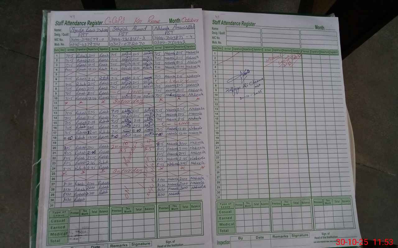| Remarks (Use Separate Page if Required): Teacher Sehrish Ahmad is absent from school without leave approval wef 20 October 2025 | |||||