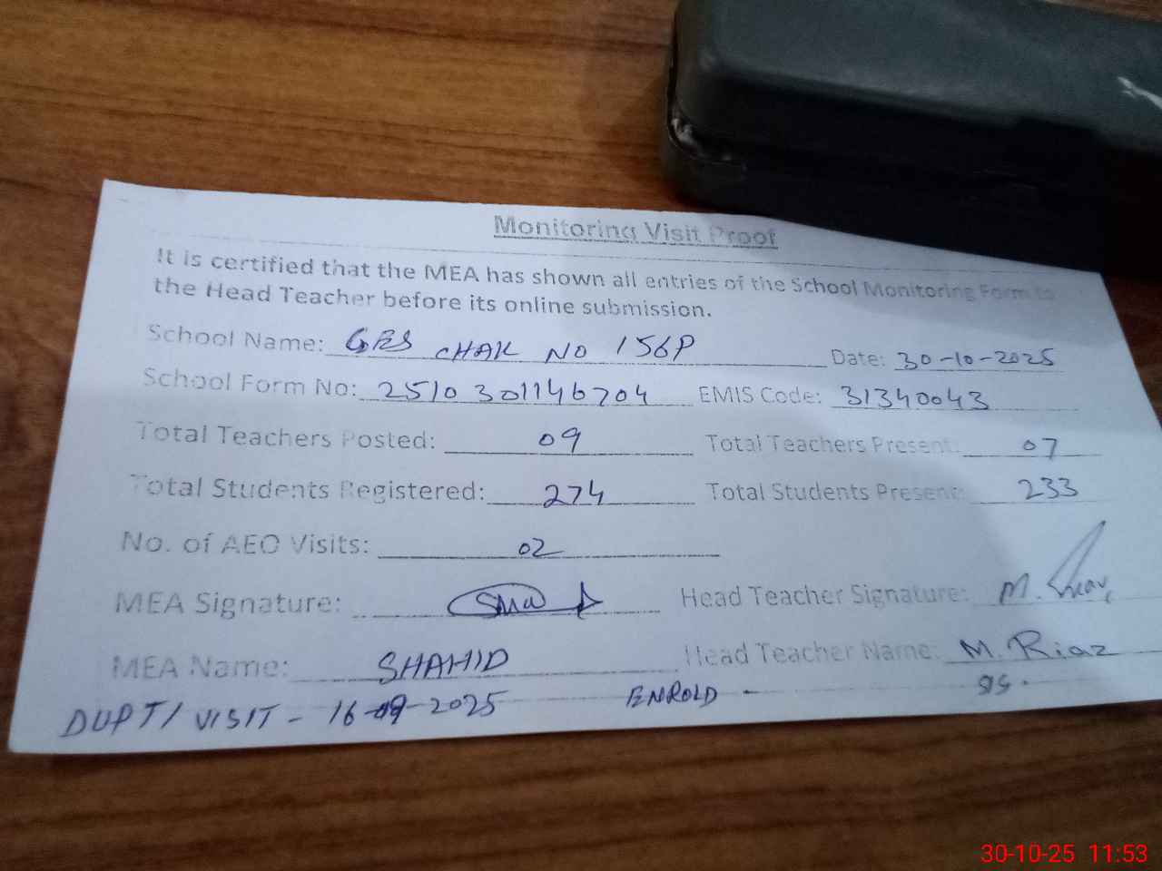 | Attendance Register | Head Teacher | MEA with School | Visit Proof |