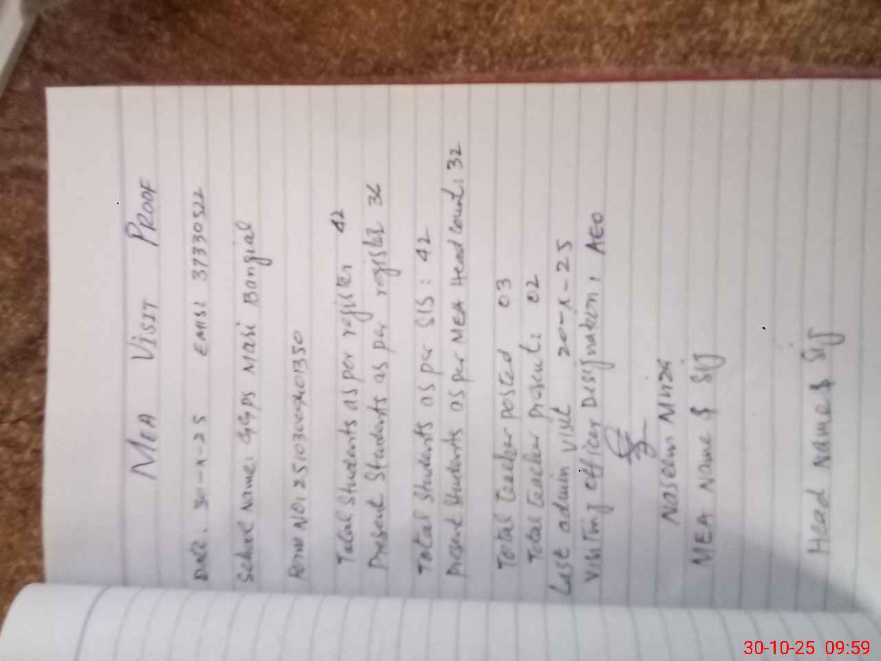 | Attendance Register | Head Teacher | MEA with School | Visit Proof |