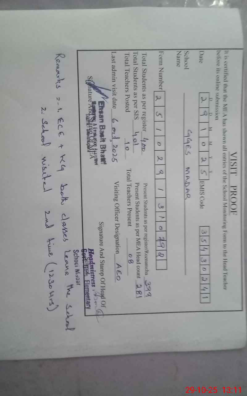 | Certified that this School was Inspected by the Undersigned MEA/DMO Today and the Information Stated Above is as Per Record. | |||||