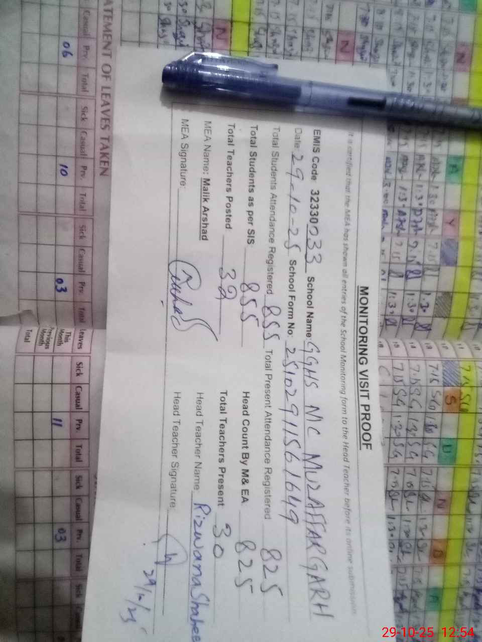 | Attendance Register | Head Teacher | MEA with School | Visit Proof |