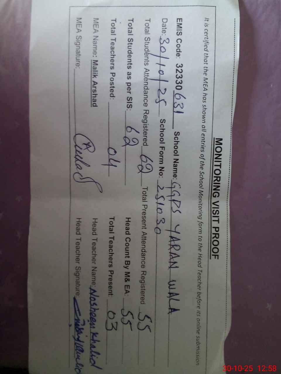 | Attendance Register | Head Teacher | MEA with School | Visit Proof |