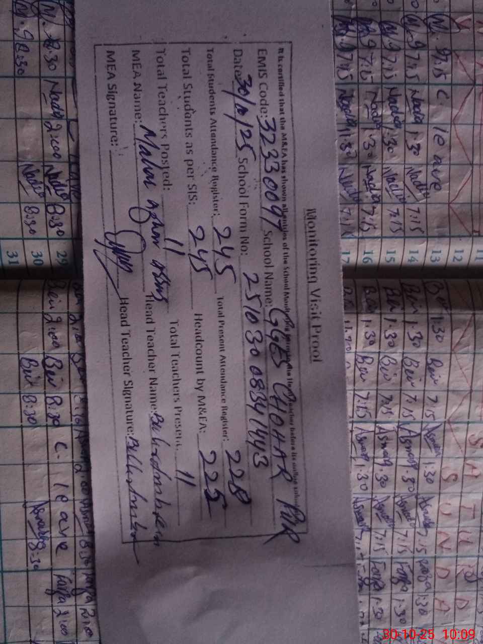 | Attendance Register | Head Teacher | MEA with School | Visit Proof |