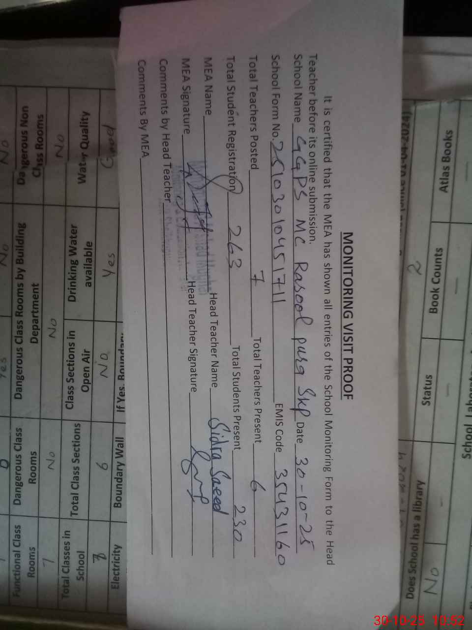 | Certified that this School was Inspected by the Undersigned MEA/DMO Today and the Information Stated Above is as Per Record. | |||||