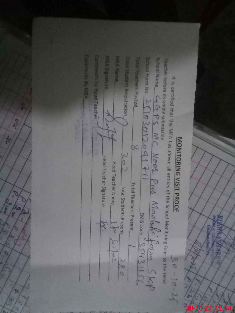 | Attendance Register | Head Teacher | MEA with School | Visit Proof |