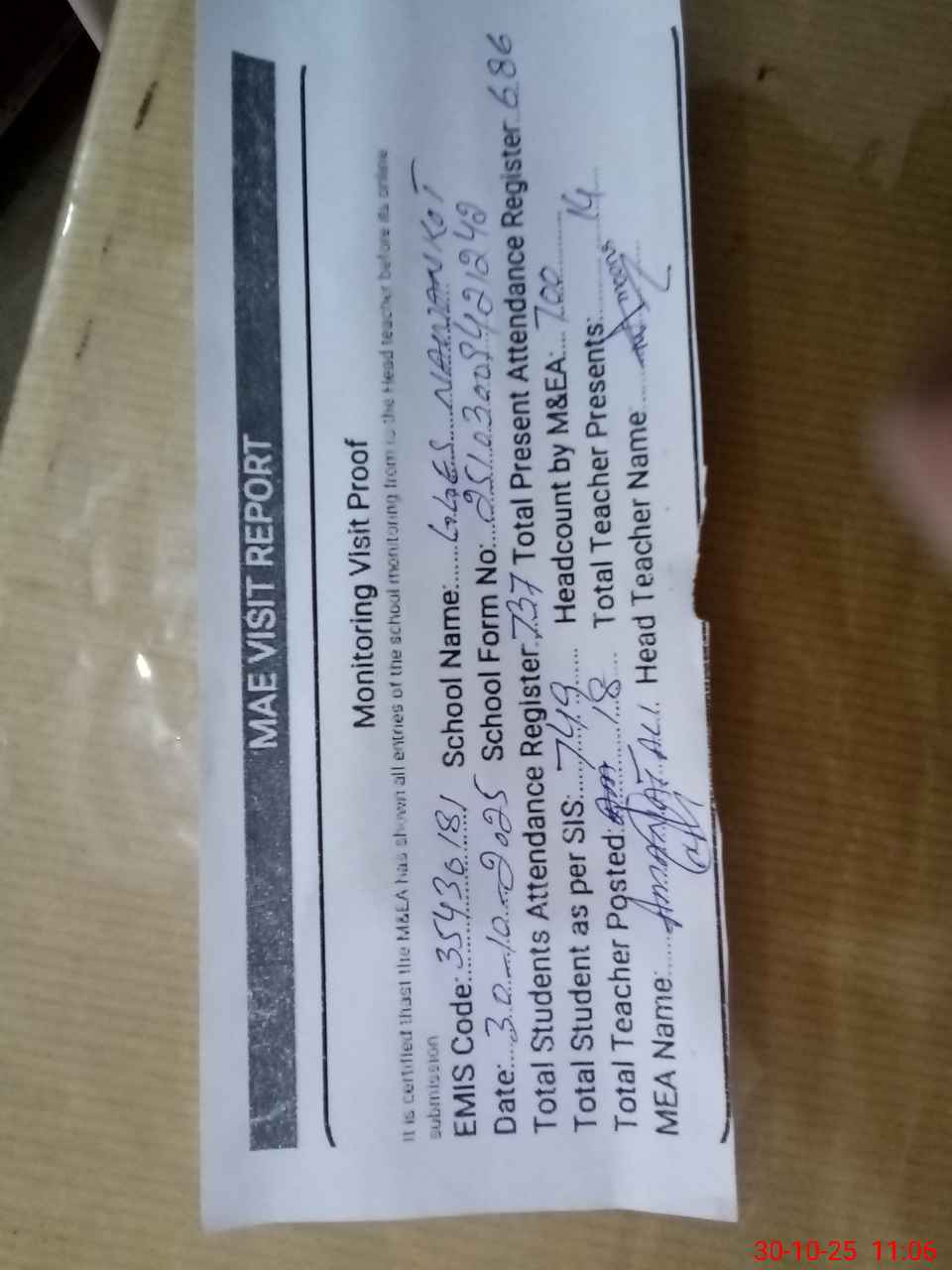 | Attendance Register | Head Teacher | MEA with School | Visit Proof |