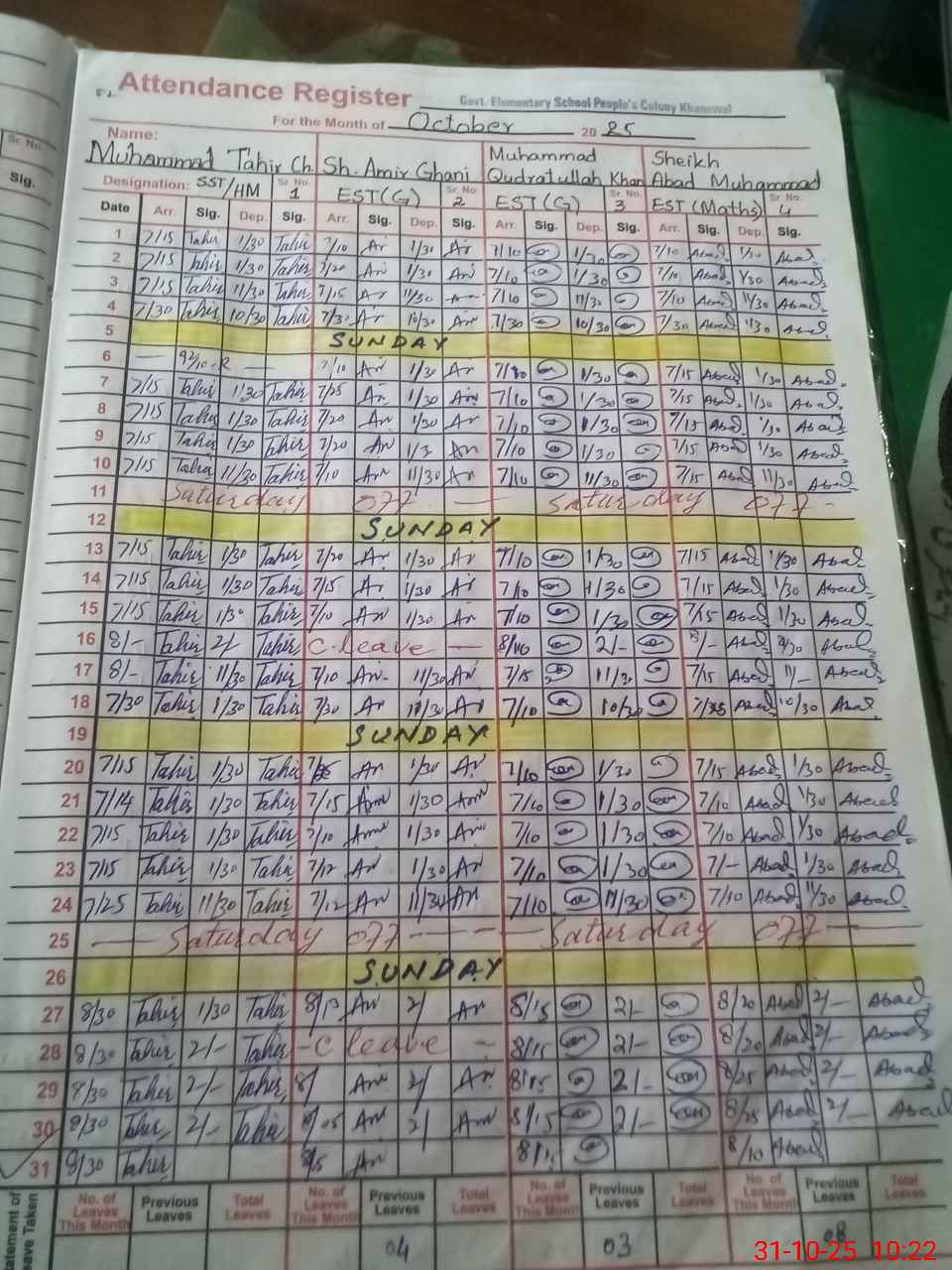 | CNIC | Full Name | Designation | R/C | Absence During Last Calender Month |