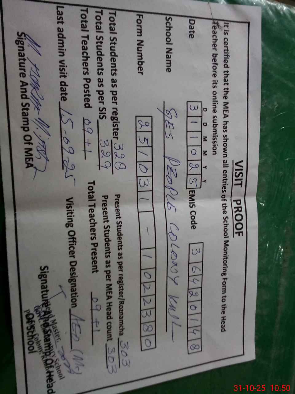 | Certified that this School was Inspected by the Undersigned MEA/DMO Today and the Information Stated Above is as Per Record. | |||||