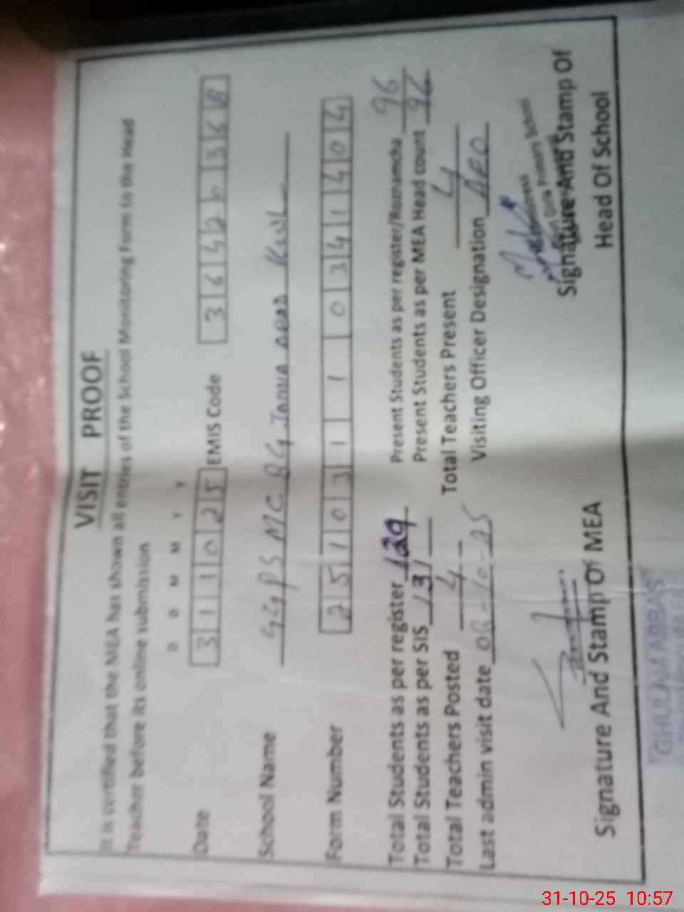 | Attendance Register | Head Teacher | MEA with School | Visit Proof |