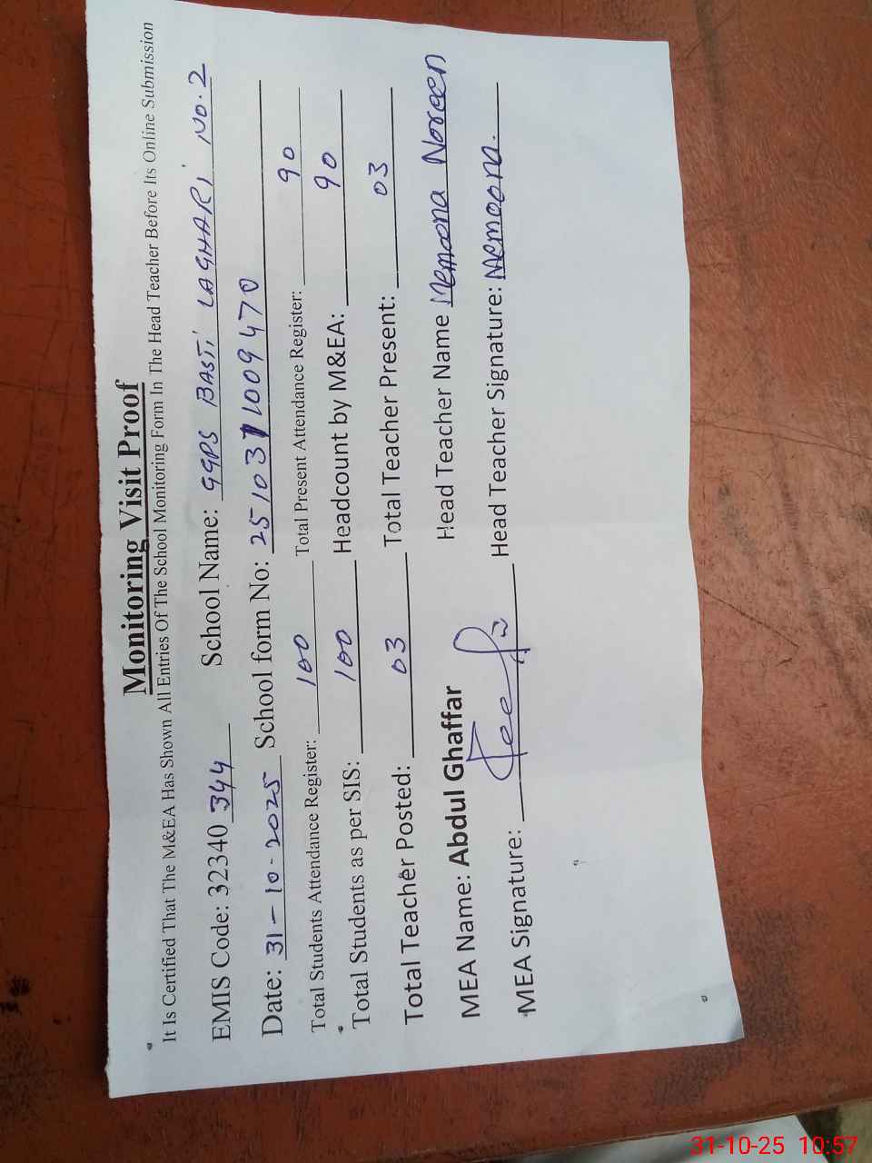 | Attendance Register | Head Teacher | MEA with School | Visit Proof |