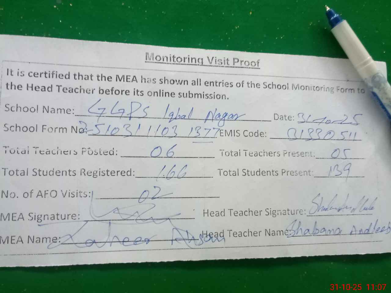 | Monitoring Date: 31-10-2025 | Start Time: 31-10-2025 10:19 AM | End Time: 31-10-2025 11:10 AM | Name of MEA: Za**** Ah**** | |