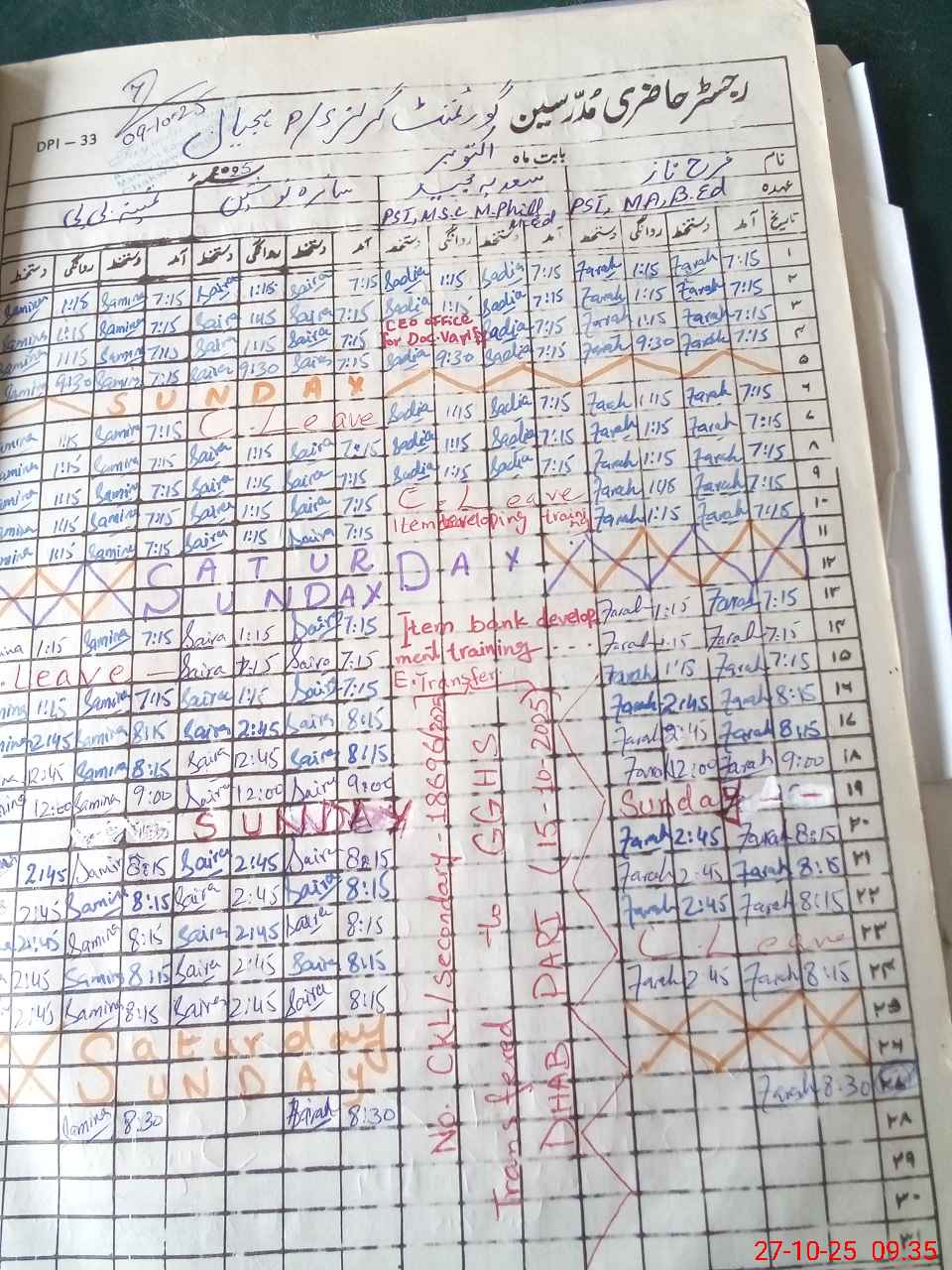 | Leave | Duty | Absent | Maternity | Medical | Ex- Pak |