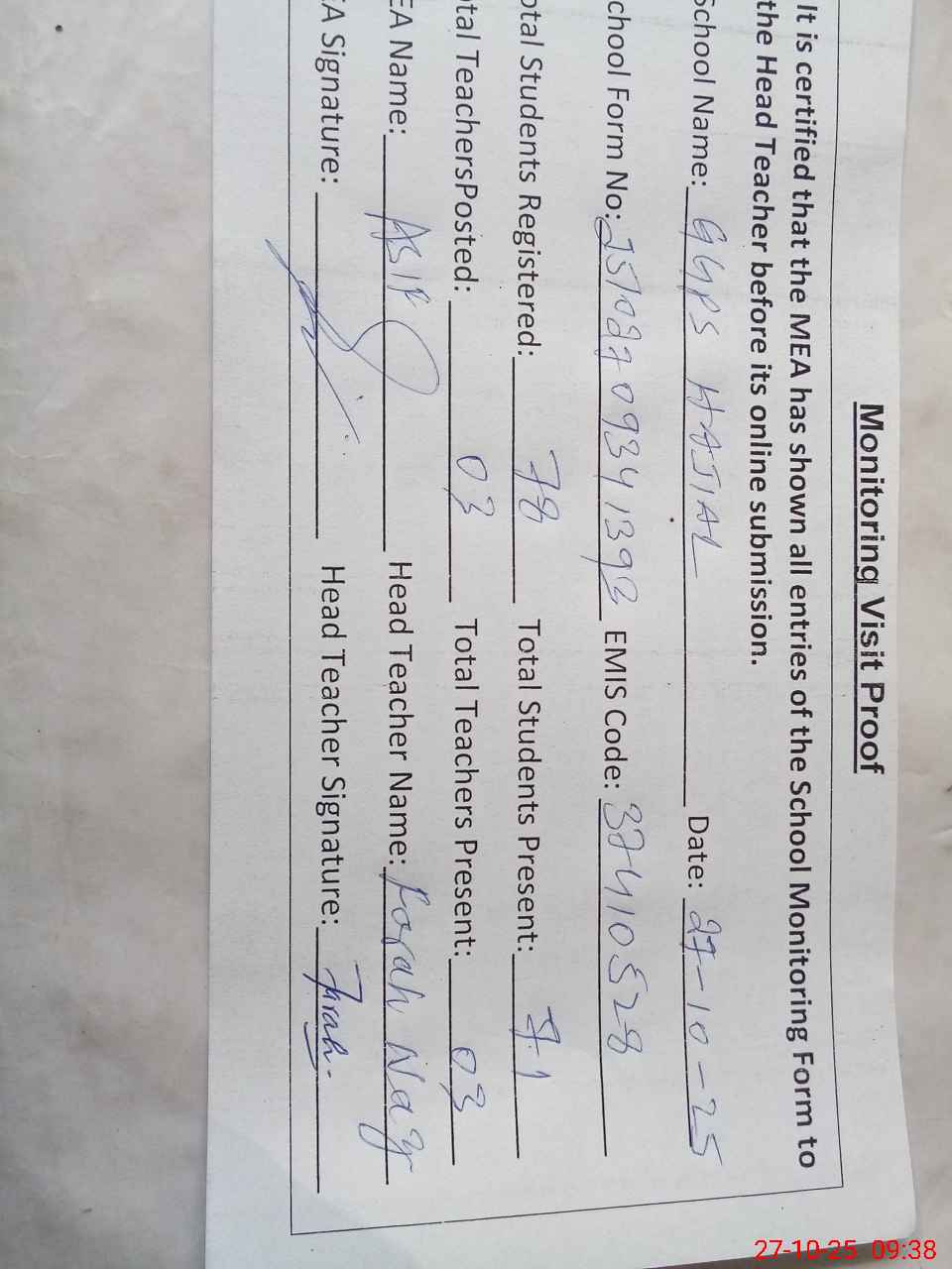 | Attendance Register | Head Teacher | MEA with School | Visit Proof |