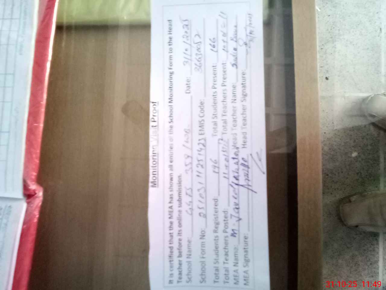 | Attendance Register | Head Teacher | MEA with School | Visit Proof |