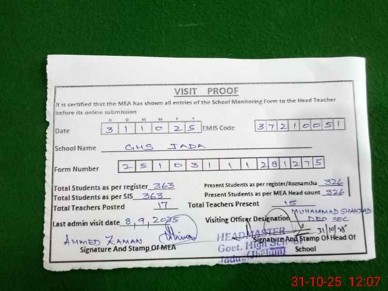 | EMIS Code: 37210051 | Name of School: GHS JADA JHELUM | |||