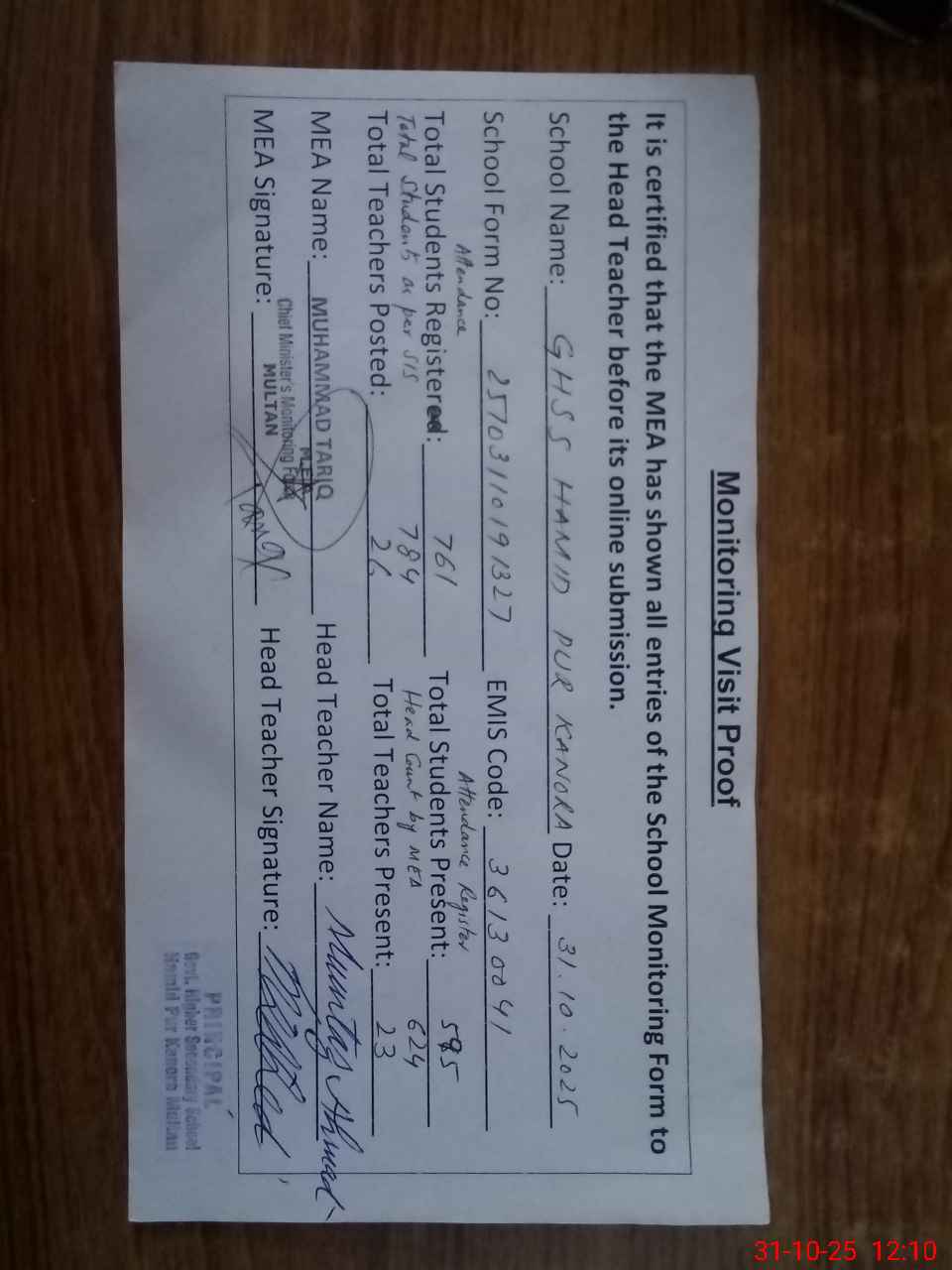| Attendance Register | Head Teacher | MEA with School | Visit Proof |
