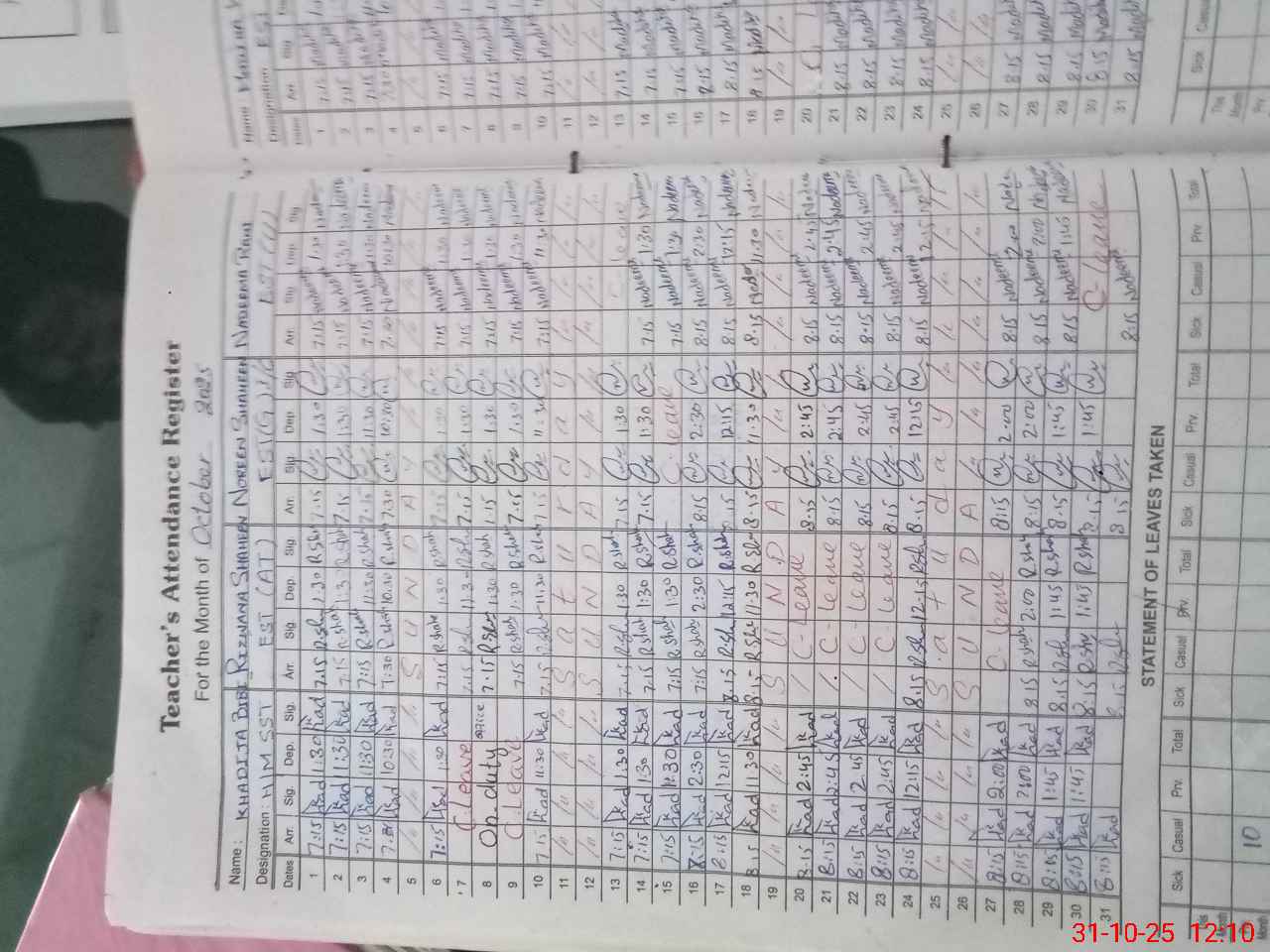 | Leave | Duty | Absent | Maternity | Medical | Ex- Pak |