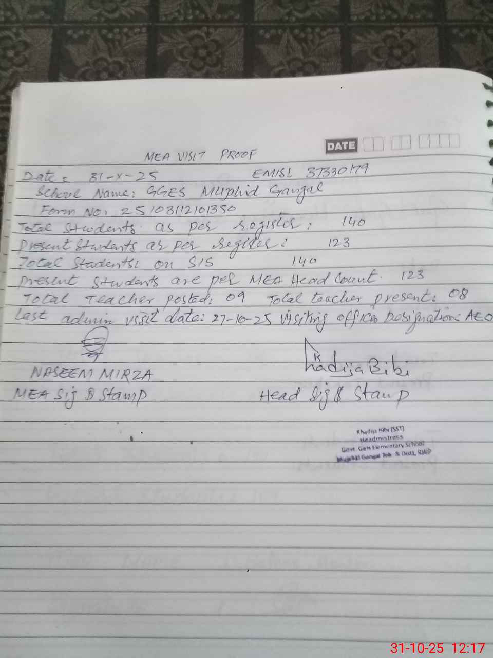 | Attendance Register | Head Teacher | MEA with School | Visit Proof |
