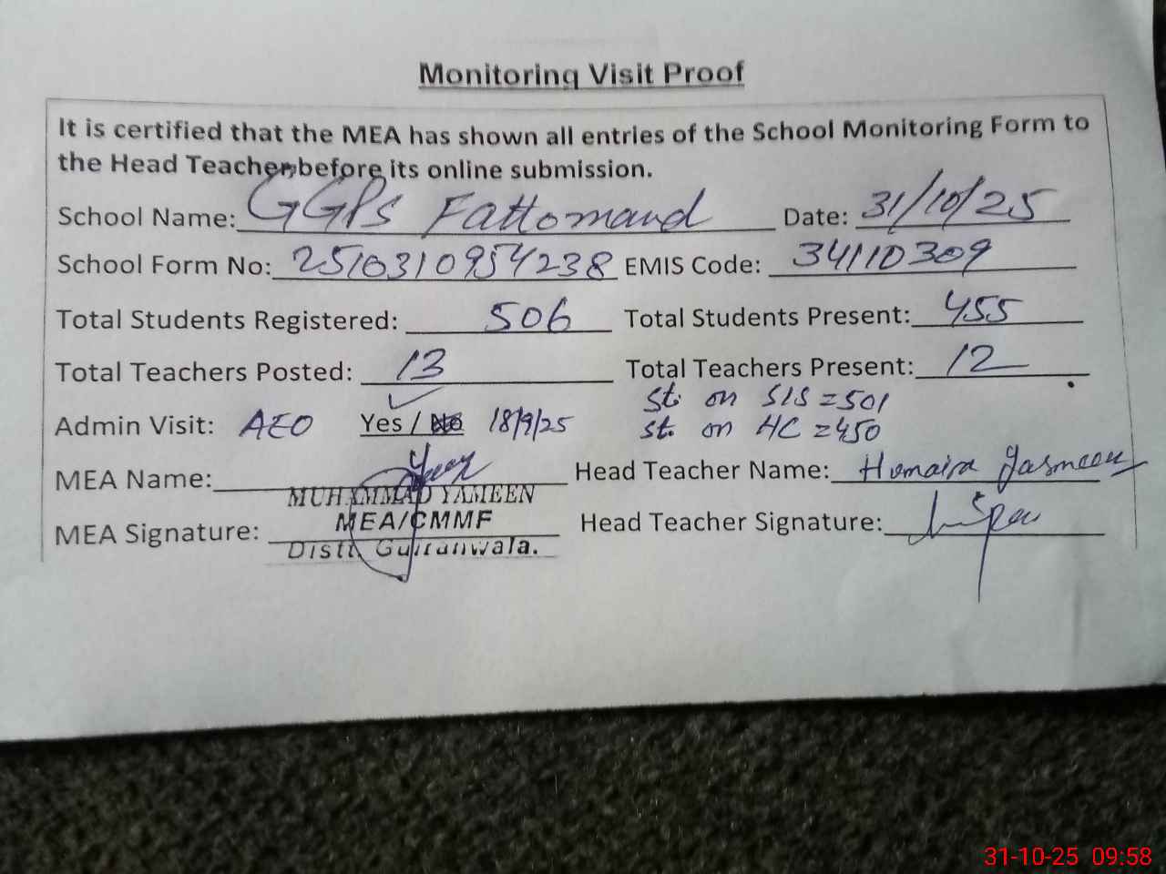 | Attendance Register | Head Teacher | MEA with School | Visit Proof |