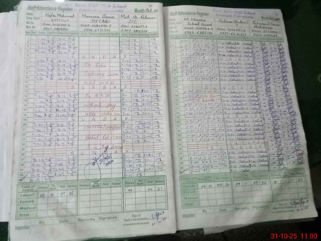 | CNIC | Full Name | Designation | R/C | Absence during last cal. month |