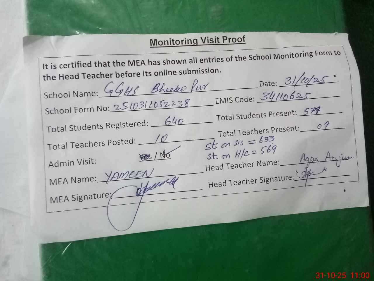 | Attendance Register | Head Teacher | MEA with School | Visit Proof |