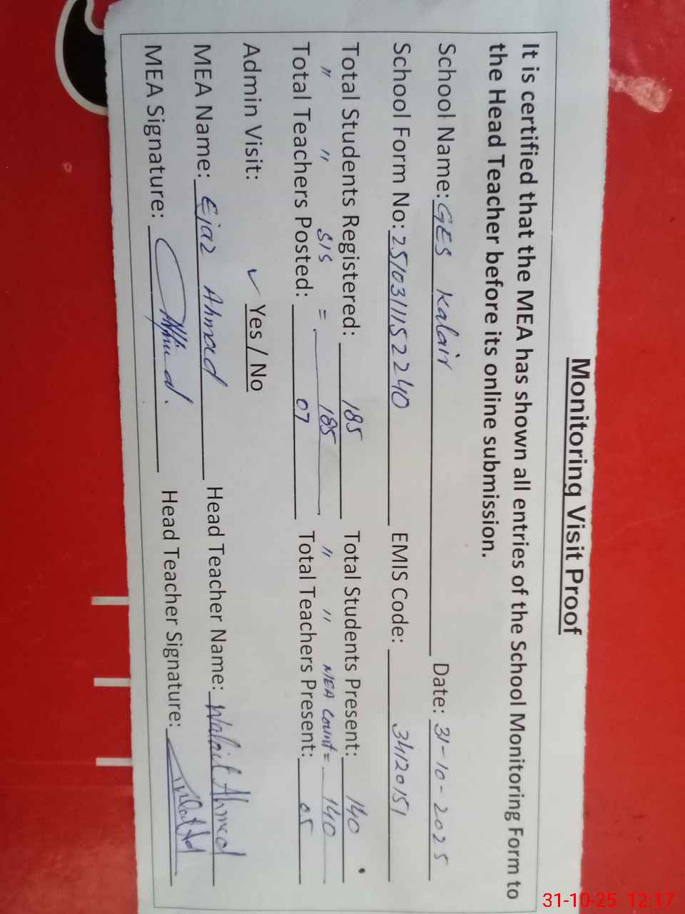 | Attendance Register | Head Teacher | MEA with School | Visit Proof |