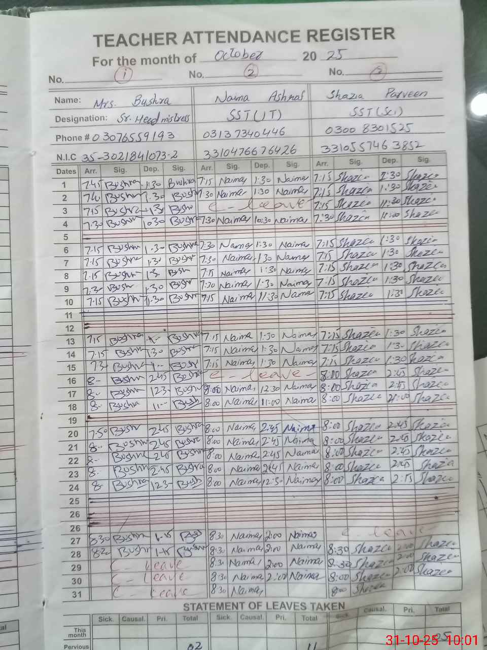 | CNIC | Full Name | Designation | R/C | Absence During Last Calender Month |