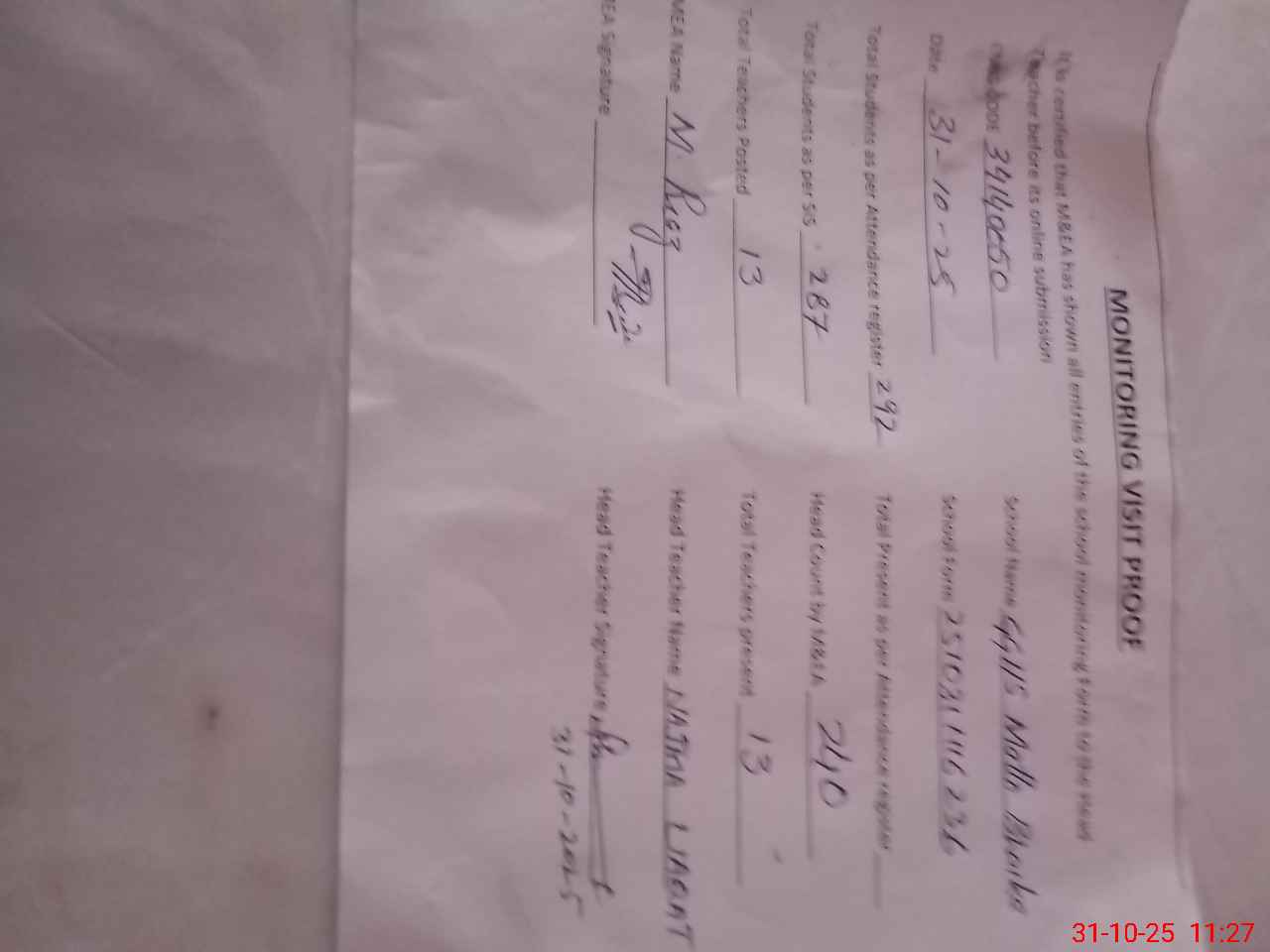| Attendance Register | Head Teacher | MEA with School | Visit Proof |