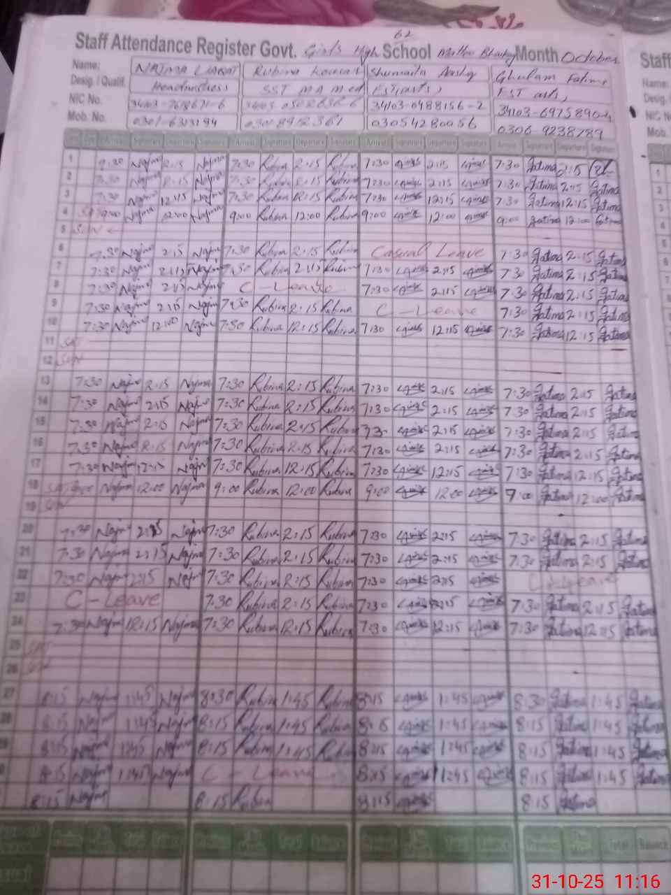 | CNIC | Full Name | Designation | R/C | Absence During Last Calender Month |