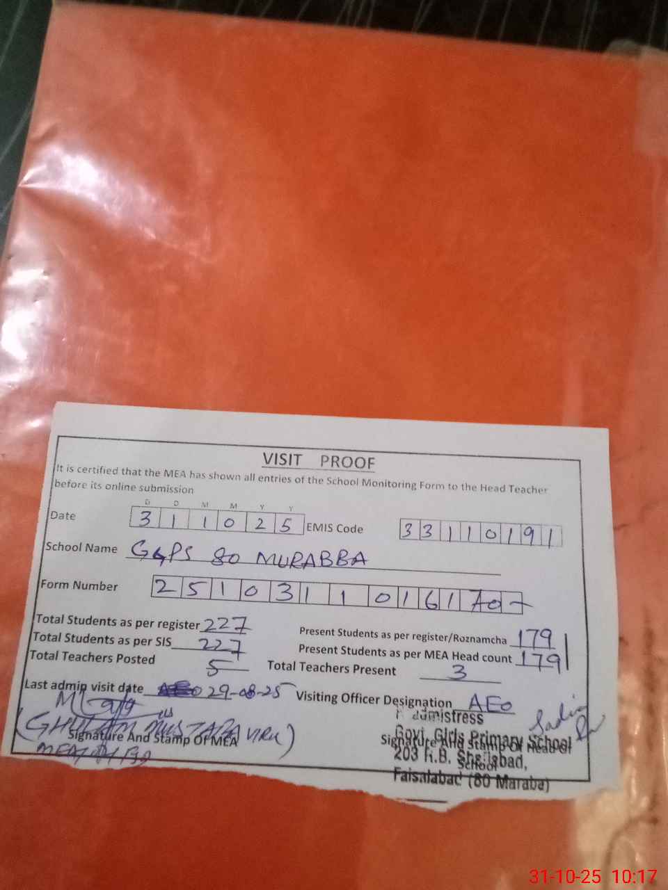 | Attendance Register | Head Teacher | MEA with School | Visit Proof |