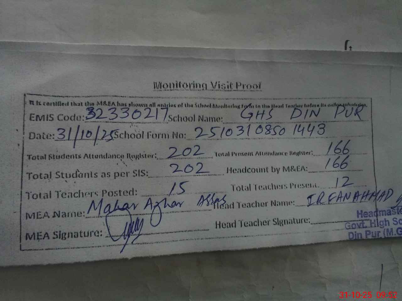 | Monitoring Date: 31-10-2025 | Start Time: 31-10-2025 08:50 AM | End Time: 31-10-2025 09:56 AM | Name of MEA: Ma**** Az**** Ab**** | |