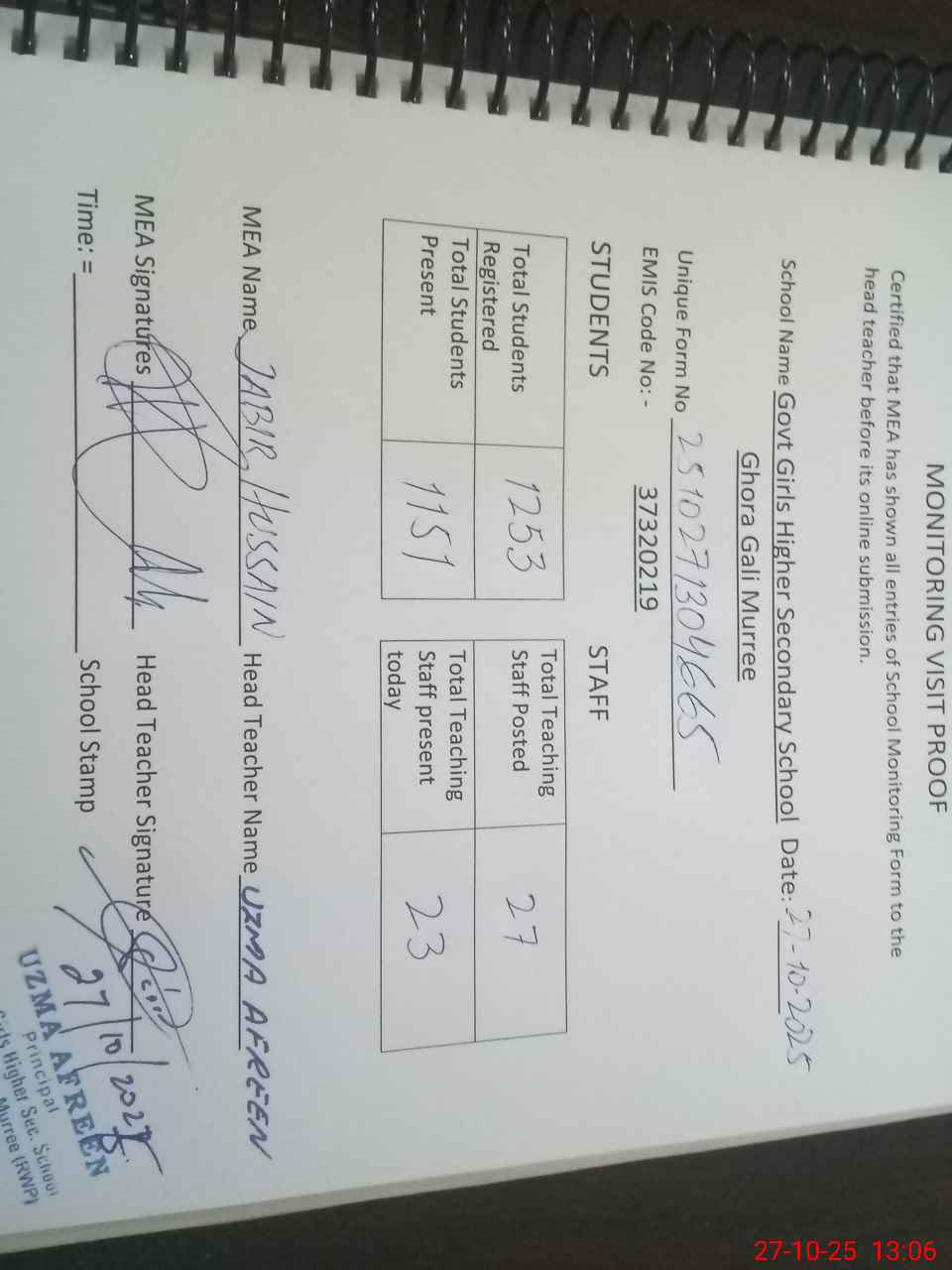 | Total no. of Classrooms: 18 No. of Classrooms Used for Teaching: 16 No. of Classrooms Storing Old Furniture, FTBs, etc: 0Comments if Any: Two teachers are absent date mentioned against each 1 Tabinda Naseer SST science June 2025 to till date 2 Fareena ashaque EST since March 2025 to till date Random class check list not updated in PMIU application Class rooms less than requireme |