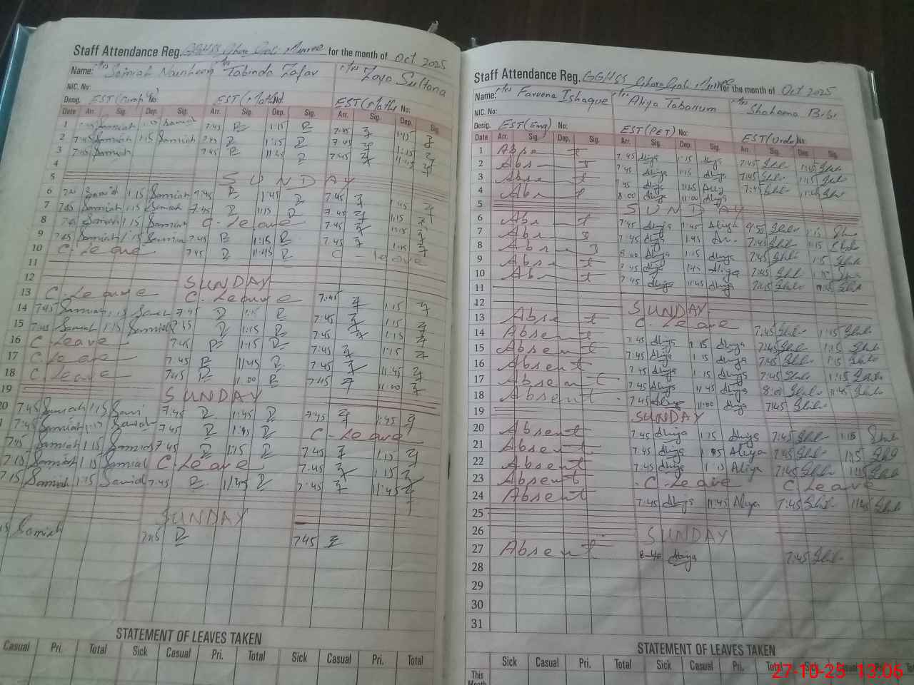 | 37**** | Fa**** Is**** | Regular | 0 | 0 | 30 | 0 | 0 | 0 | 0 | 0 | 0 | Absent (Un-Authorized) | |