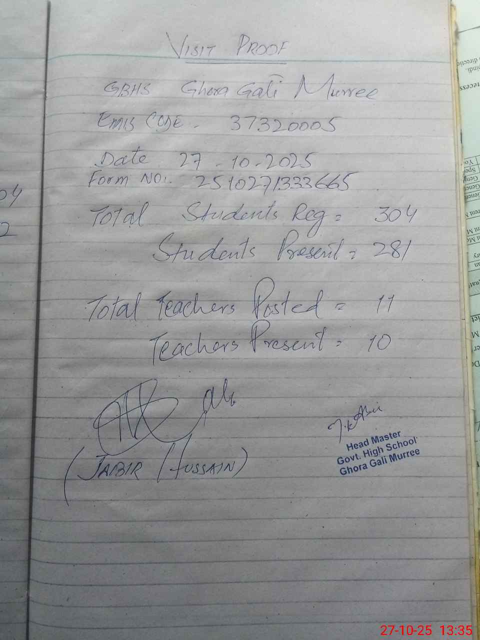 | EMIS Code: 37320005 | Name of School: GHS GHORA GALI | |||