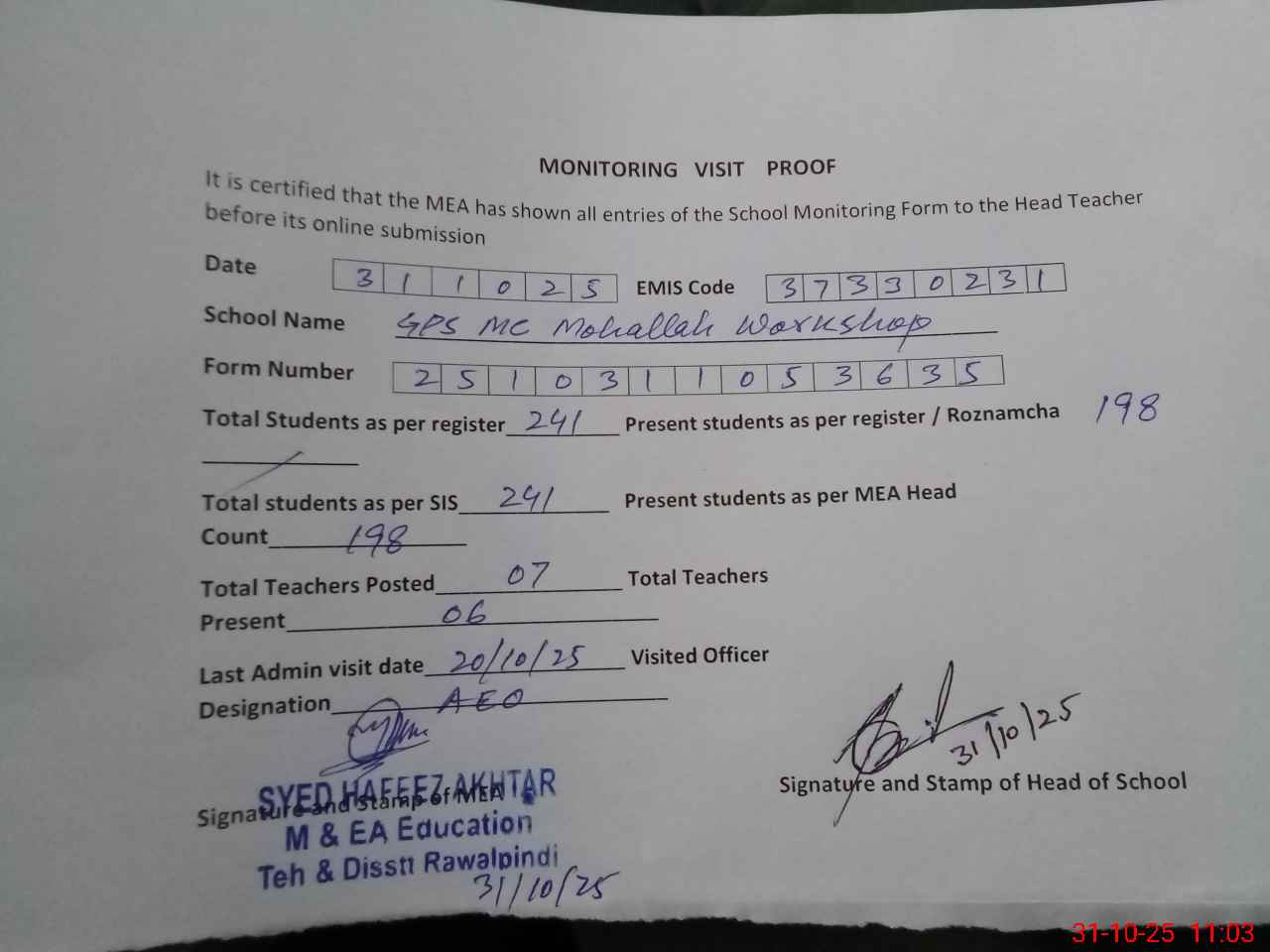 | Attendance Register | Head Teacher | MEA with School | Visit Proof |