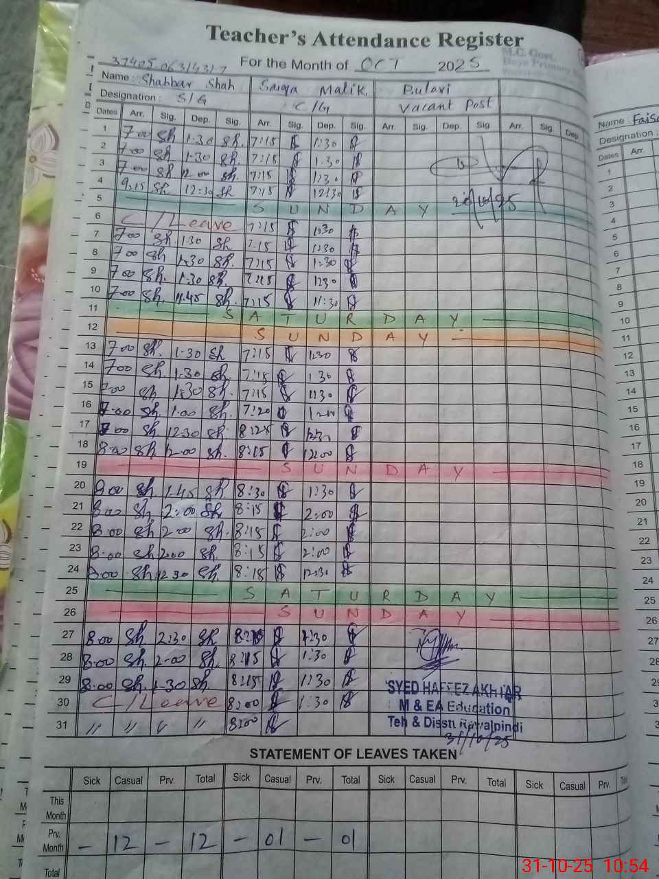 | CNIC | Full Name | Designation | R/C | Absence During Last Calender Month |
