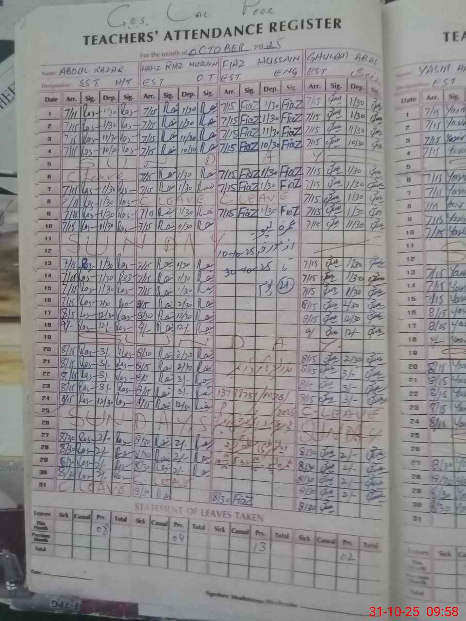 | CNIC | Full Name | Designation | R/C | Absence During Last Calender Month |