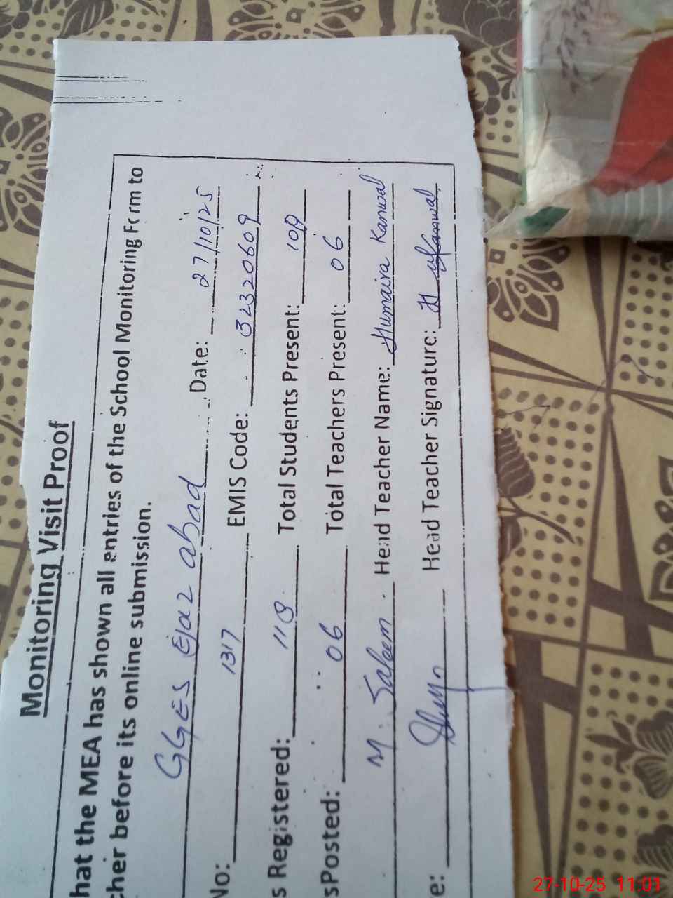 | Attendance Register | Head Teacher | MEA with School | Visit Proof |