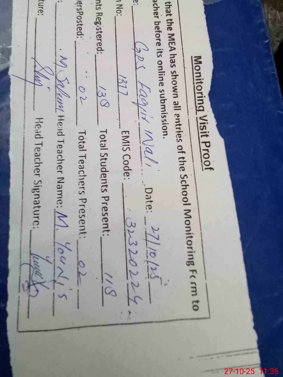 | Attendance Register | Head Teacher | MEA with School | Visit Proof |