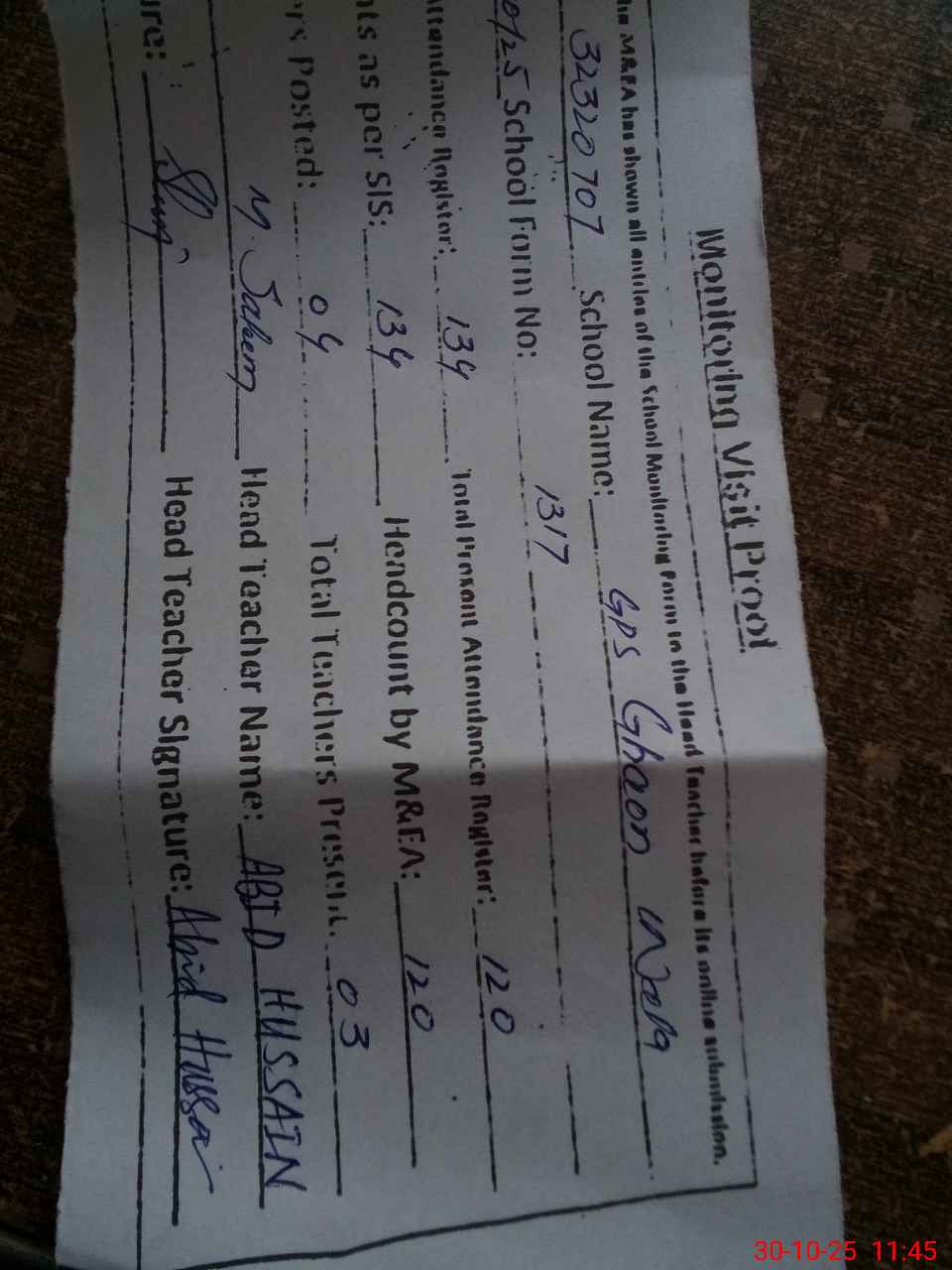 | Attendance Register | Head Teacher | MEA with School | Visit Proof |