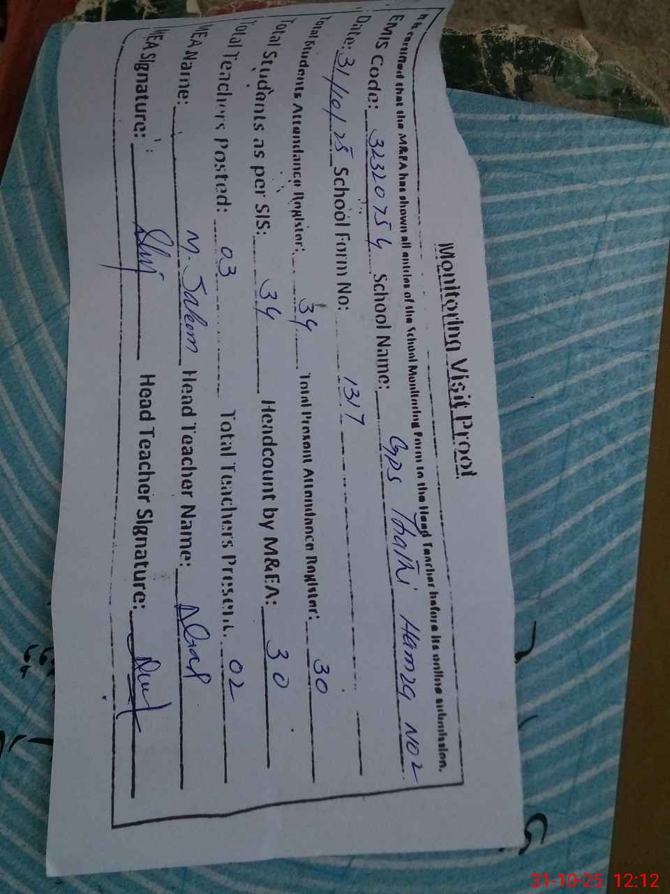 | Attendance Register | Head Teacher | MEA with School | Visit Proof |
