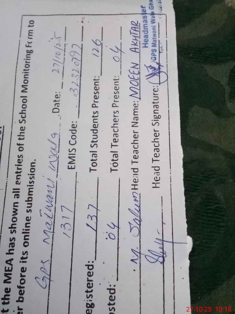 | Name: M.**** Designation: (School Headmaster's/Headmistress's) PST Phone/Cell Number: 03**** |
