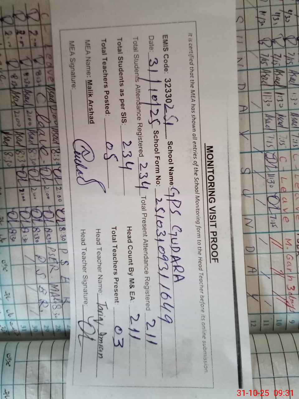 | Attendance Register | Head Teacher | MEA with School | Visit Proof |