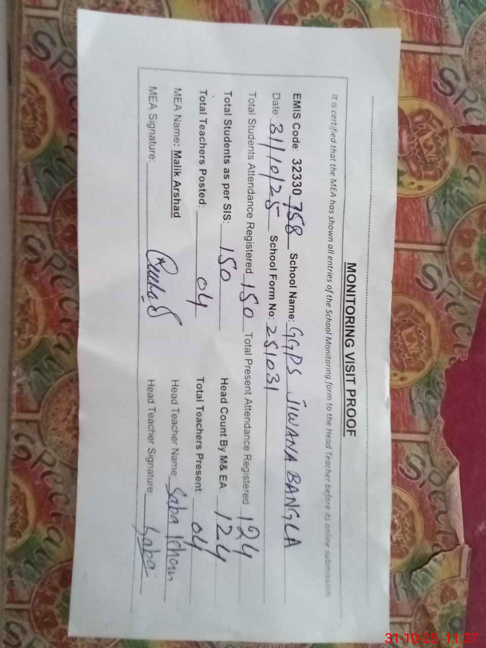 | Attendance Register | Head Teacher | MEA with School | Visit Proof |