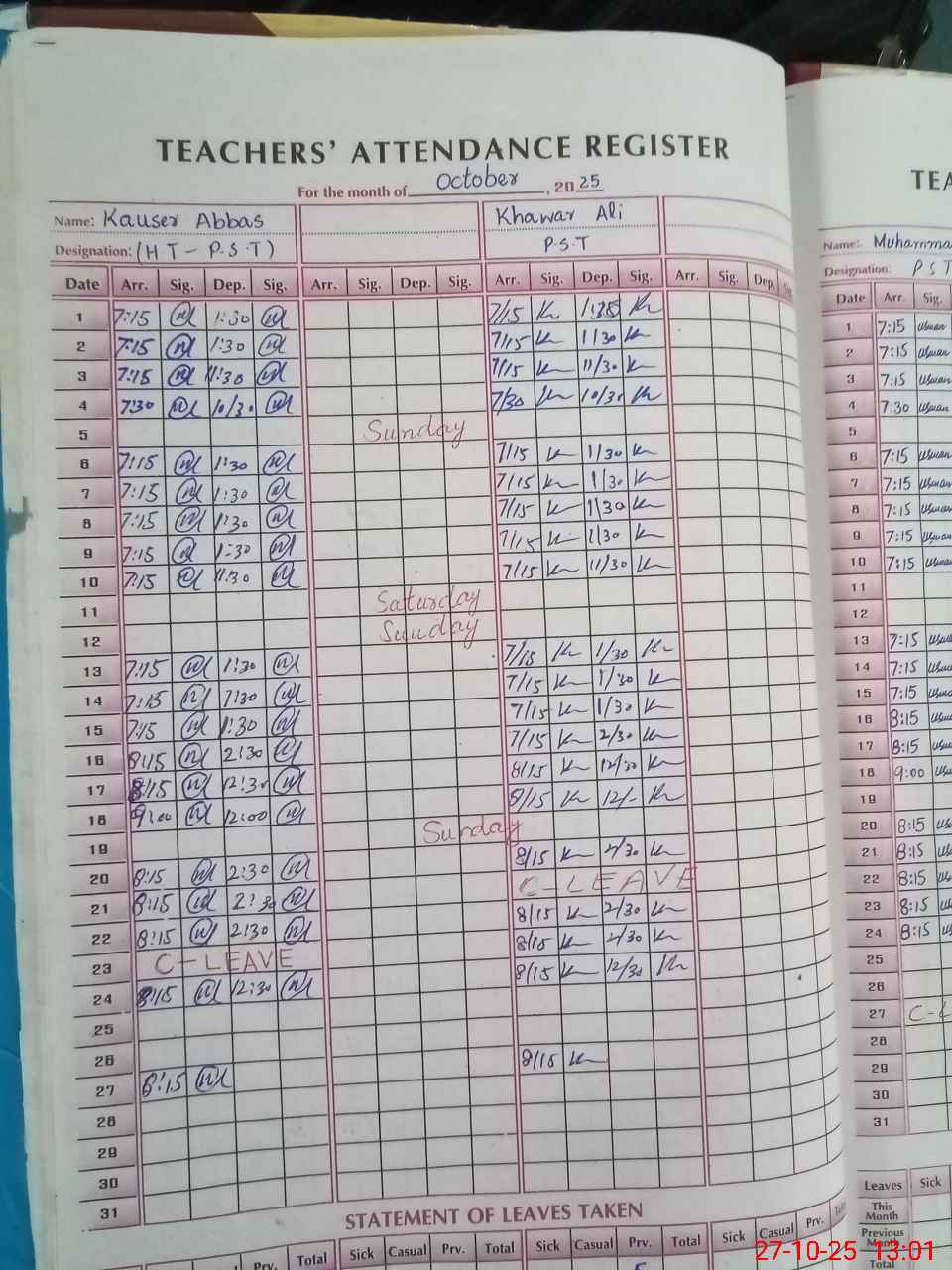 | Leave | Duty | Absent | Maternity | Medical | Ex- Pak |