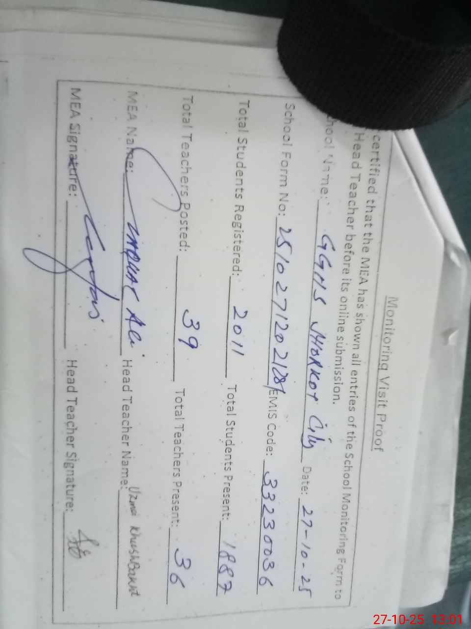 | Attendance Register | Head Teacher | MEA with School | Visit Proof |